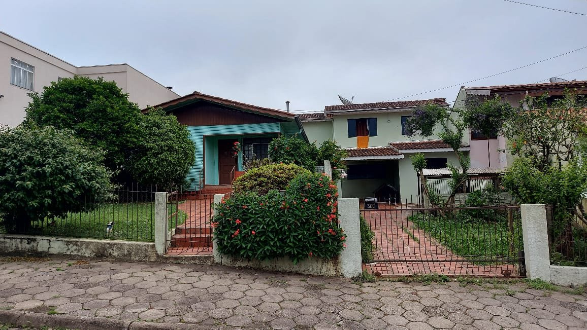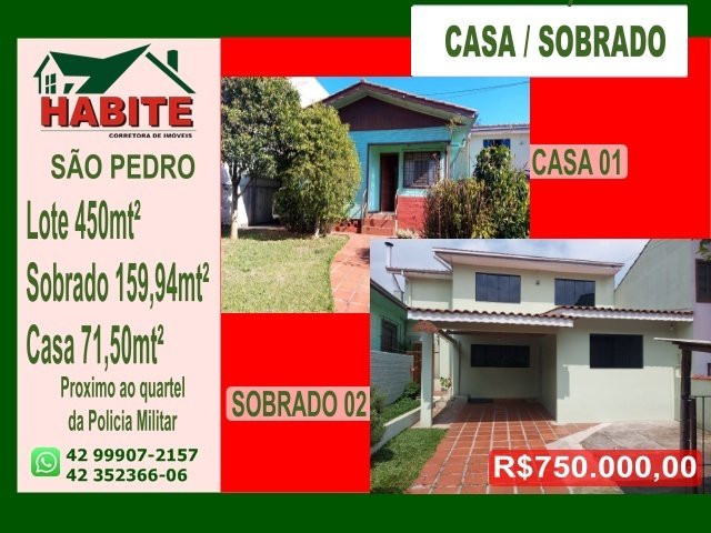 sobrado mais casa de madeira a venda no bairro São Pedro, próximo a igreja do bairro, sobrado contendo dois dormitórios, sala de estar, dois banheiros, cozinha semi-mobiliada, área de serviço, garagem, jardim, área total do sobrado 159.94mt². E a casa de madeira contendo, sala de estar, cozinha, banheiro, lavanderia, churrasqueira, três quartos, garagem, jardim área total da casa averbada 71,50mt² área da casa construída 90mt² e o terreno total de ambas as casas 450mt².